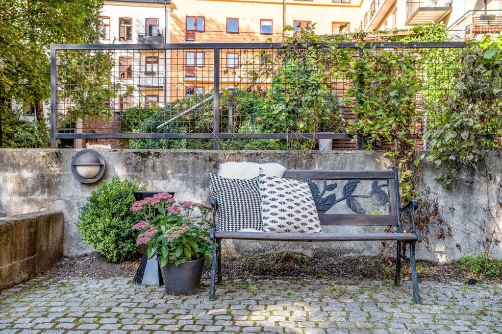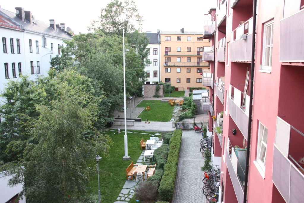 På hjørnet av gården har det vært ulike butikker, bl.a. et melkeutsalg. Butikken er omgjort til leilighet. Loftene er også utbygd til leiligheter, men i kjelleren har vi fellesarealer med vaskeri, bryggeri og bokbyttehylle. I hagen har vi bocciabane og hengekøye for de som vil ta seg en hvil. Vi deler hage med to nabogårder, og her har vi sittegrupper, urtehage og lekeapparater.