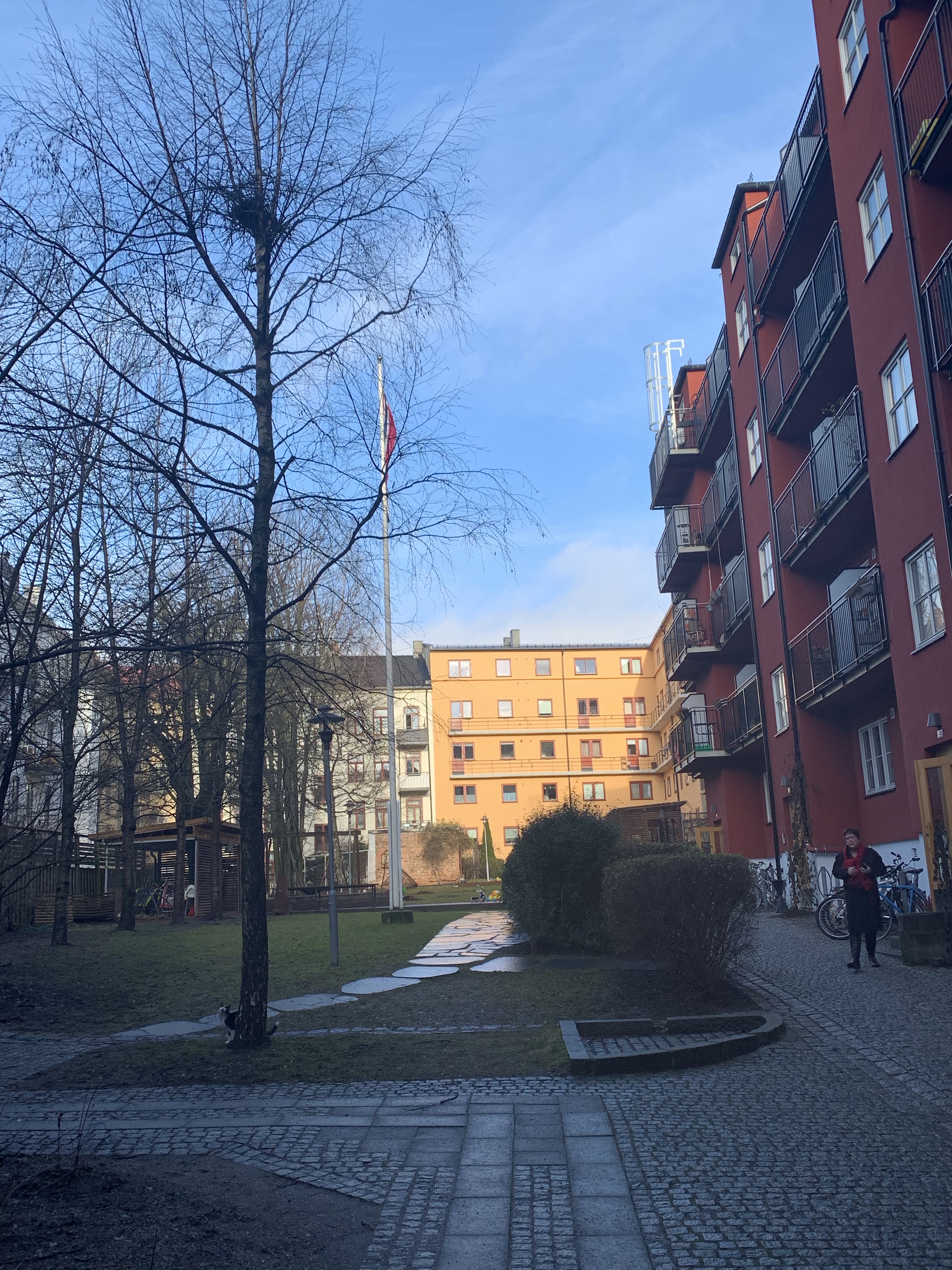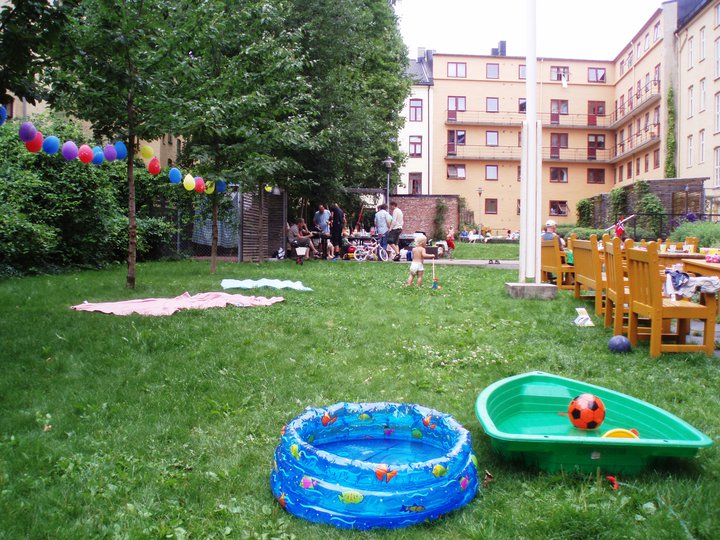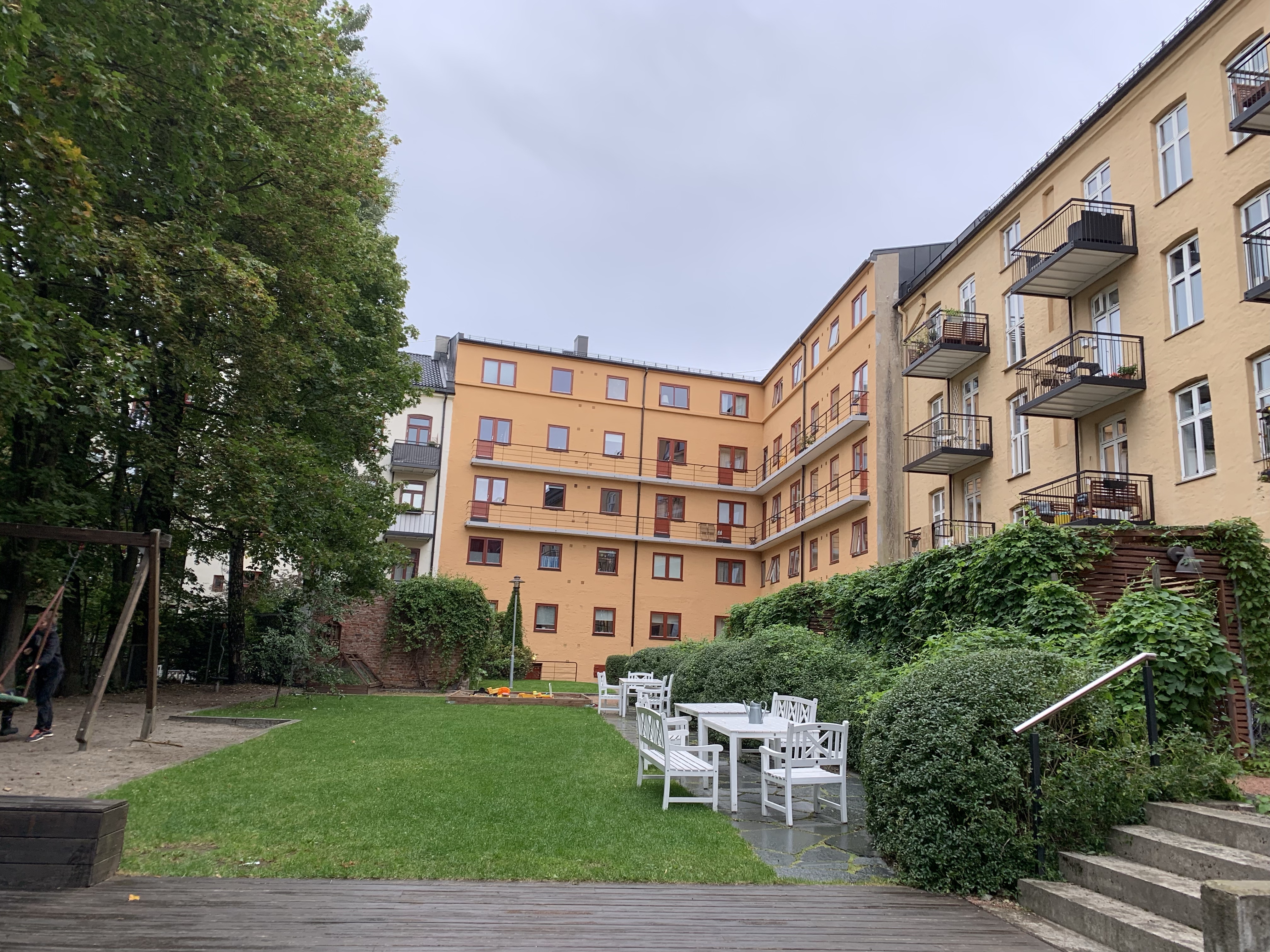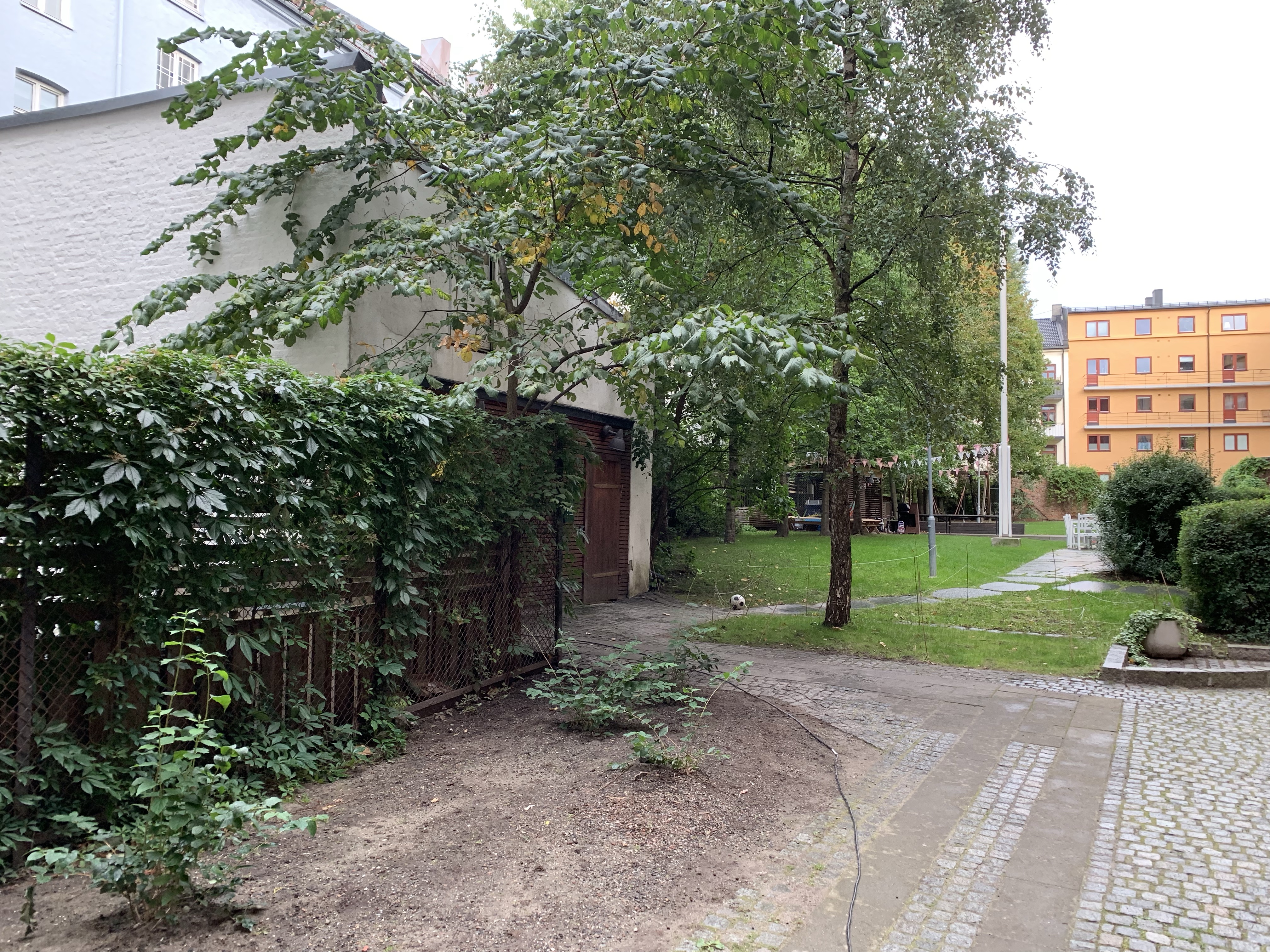 På hjørnet av gården har det vært ulike butikker, bl.a. et melkeutsalg. Butikken er omgjort til leilighet. Loftene er også utbygd til leiligheter, men i kjelleren har vi fellesarealer med vaskeri, bryggeri og bokbyttehylle. I hagen har vi bocciabane og hengekøye for de som vil ta seg en hvil. Vi deler hage med to nabogårder, og her har vi sittegrupper, urtehage og lekeapparater.